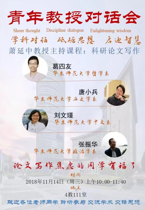 在本学期“如何撰写学术论文”选修课程中,定于11月14号(周三)上午10:00-11:40,安排青年教授与学生们的“学术对话”,地点在4教111教室,详情请见附件!
