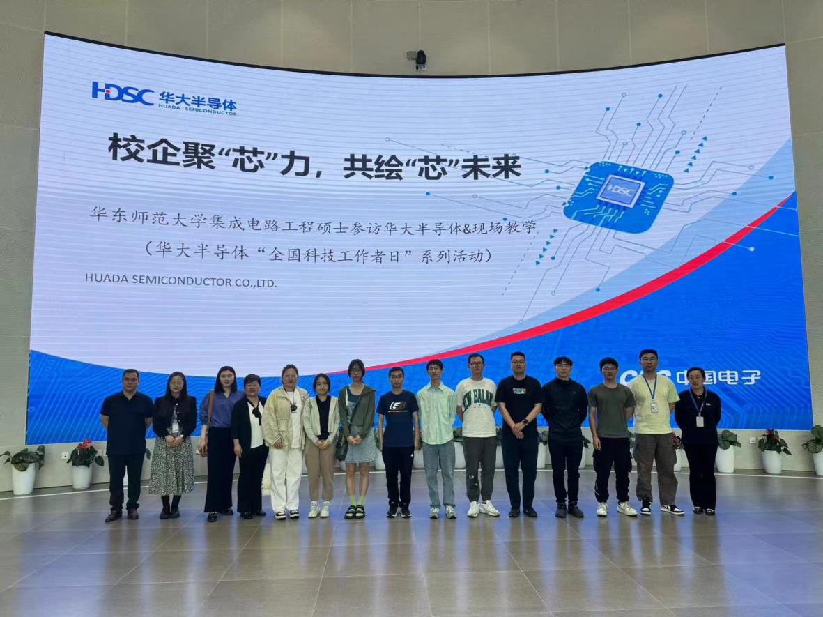 大家参观了华大半导体有限公司半导体展厅,随后开展了“校企聚’芯’力,共绘’芯’未来”的现场教学活动。 教学活动首先由华大半导体有限公司科技创新部主任付丹给师生详细介绍了华大半导体业务情况,让大家对华大的发展历史、主营业务、产业链、先进工艺及科技成就等方面有了更详细的了解。随后,华师大集成电路学院副研究员黄磊磊老师结合团队科研情况,谈了对集成电路行业研究趋势的分析。汽车电子战略市场部张羽琦做了题为《支撑国家战略 提升车载芯片自主比例》的主题演讲,详细介绍了华大半导体在汽车电子行业的布局情况。PC控制事业部资深工程师仲光明结合自己的个人从业经历,与同学们分享了“集成电路行业小白成长记”。最后,与会人员展开了热烈的交流和研讨。