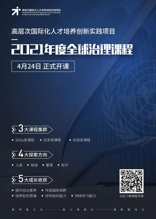2.全球治理线上课程:2021年春季,项目邀请来自康奈尔大学、乔治华盛顿大学、爱丁堡大学等国际顶尖高校和来自联合国教科文组织等的国际组织教员/官员,进行线上直播授课,内容聚焦全球治理理念、全球经济可持续发展、公共政策等。其中教授课为每周 2.4 小时,5 周共计 12 小时,16学时。助教课为每周 1.8 小时,5 周共计 9 小时,12学时。
