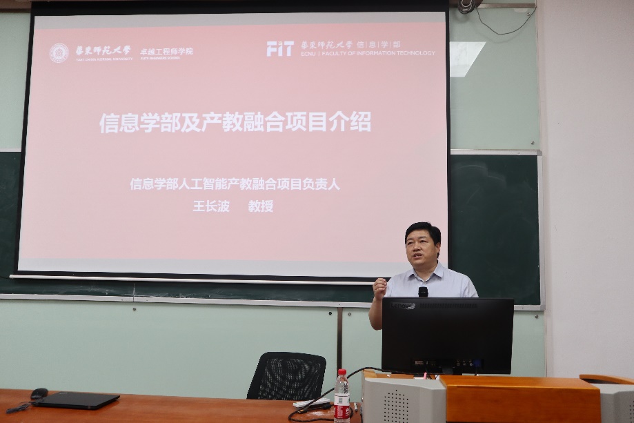 随后,人工智能产教融合项目负责人王长波教授,从人才培养目标、产教培养理念、联合培养模式以及已有基础等方面详细介绍了信息学部人工智能产教融合项目。他强调了产教融合的培养理念,即聚焦人工智能领域在新时代的战略需求,切实推动产教深度融合、科教协同与学科交叉,构建包括校企合作研究、实习实训、双导师指导、企业参观、产教论坛等在内的协同育人体系,帮学生提升知识水平的同时,在行业应用实践中提升综合能力。