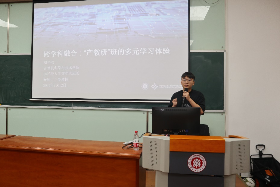 夏令营还邀请了2023级人工智能产教班班长周裕浩同学作为在读学生代表发言。他从专业知识学习、科研训练和实践经验等方面分享了自己一年来的学习经历与心得体会。他介绍了人工智能产教融合项目设计的跨学科课程、创新教学方法、产学研合作平台、以及灵活的学术评价等特色举措,并结合自己的学习体会,鼓励同学们好好利用校企双方的资源,在实践中提升自己的科研与创新能力。