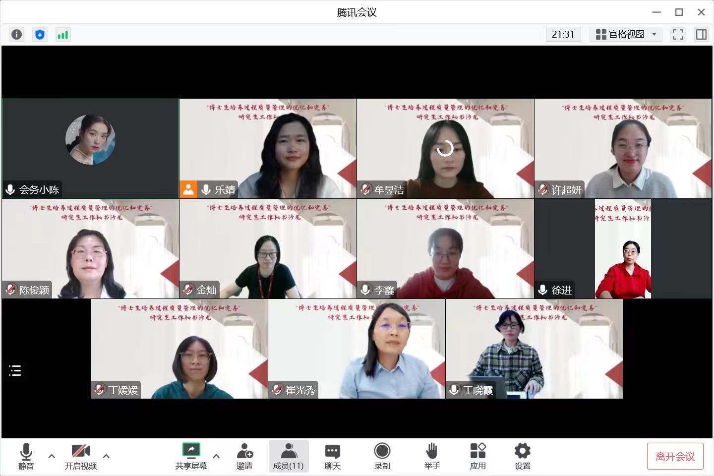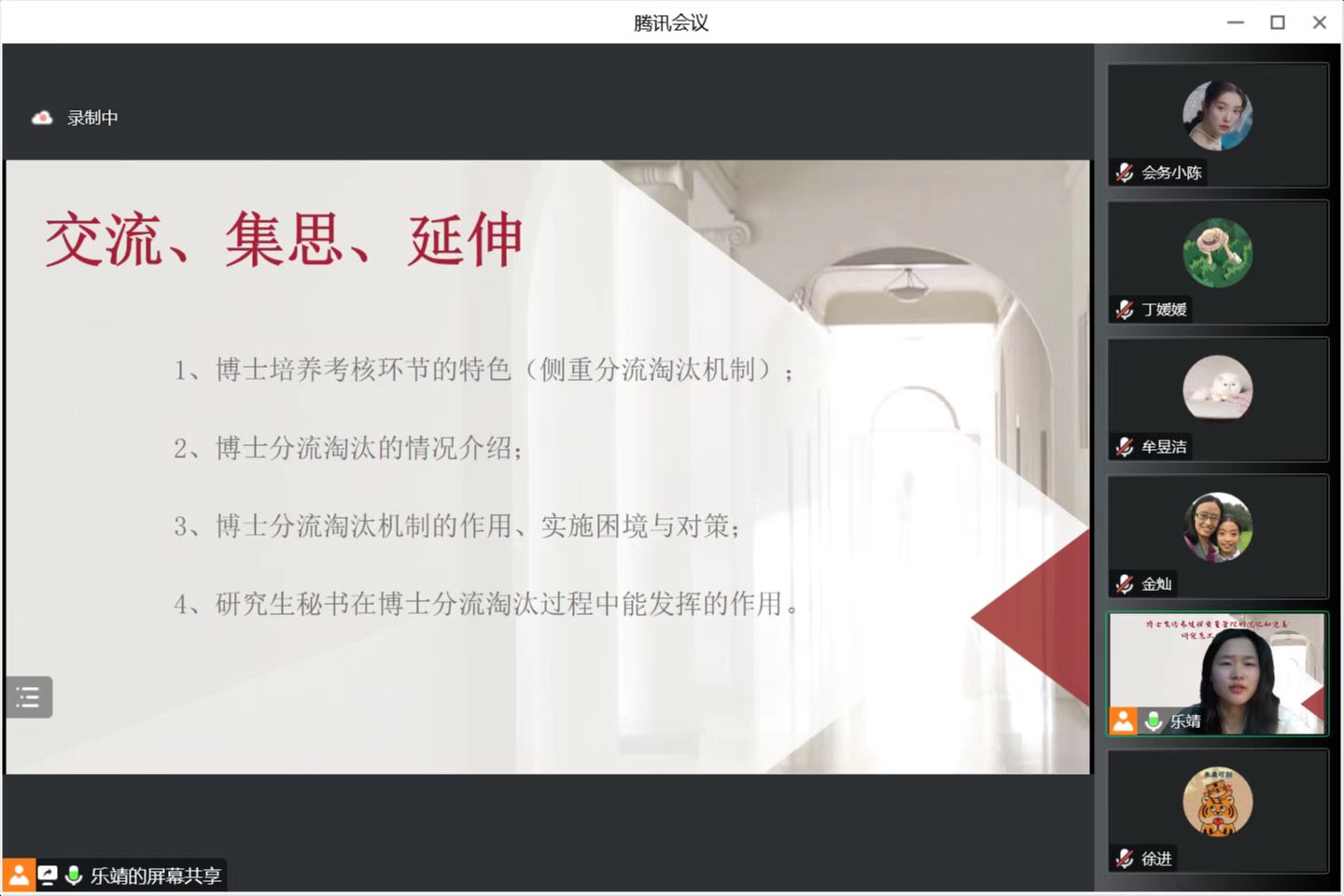 博士研究生是我国经济社会转型的重要推动力量。随着我国产业转型升级和社会经济的快速发展,社会对高质量人才、领军人才的需求更加迫切。为推进博士生教育高质量发展,健全博士生培养质量管理体系,以“博士生培养过程质量管理的优化和完善——博士生分流淘汰机制的实施困境与对策”为主题的研究生工作秘书沙龙于20221021日以腾讯线上会议形式成功举行。河口海岸研究院研究生工作秘书金灿、生态与环境科学学院研究生工作秘书丁媛媛作主要分享,研究生培养办公室崔光秀及来自不同院系的研究工作秘书等10位老师参加研讨会。会议由政治与国际关系学院研究生工作秘书乐靖主持。