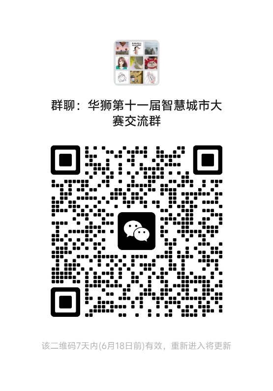 (6)交流咨询:请参赛队员扫码,加入微信工作群,跟进大赛流程、讲座培训以及交流咨询。进群后,请注明“院系+姓名+智慧城市参赛”。