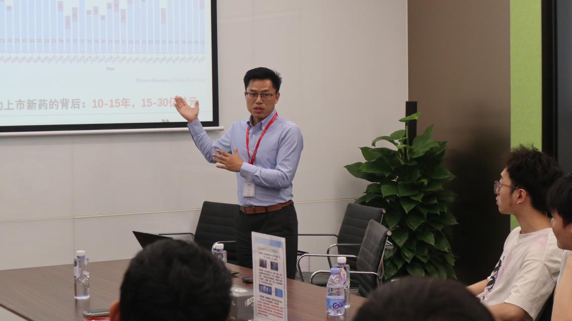 上海元码智药生物技术有限公司的创始人兼CEO曾贤博士以及运营副总姚雪纯热情接待了来访师生。曾贤博士首先作了题为“生成式人工智能时代的生物制药设计”的报告。他从药物研发与AI结合的时代背景、AI制药的基本问题与挑战、生成式AI算法在蛋白质设计中的发展前沿三个方面进行了详细介绍。曾博士强调,在传统药物研发过程中存在的高成本、长周期以及低成功率等问题,通过引入AI技术可以得到显著改善。他还分享了其团队在利用生成式AI算法进行蛋白质设计方面的最新研究成果,展示了这些技术如何能够加速新药发现过程并提高效率。