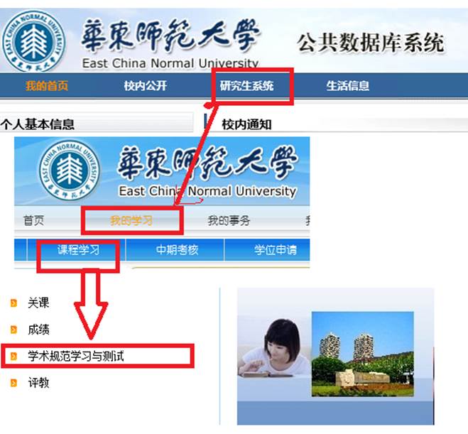 1、登录公共数据,进入研究生系统,在我的学习之课程学习中点击“学术规范学习与测试”链接即可进入系统。然后点击“东师范大学研究生信息管理系统建设建议征询”链接即可撰写并提交建议。如果您是学术型学位研究生,请直接选择此方式。